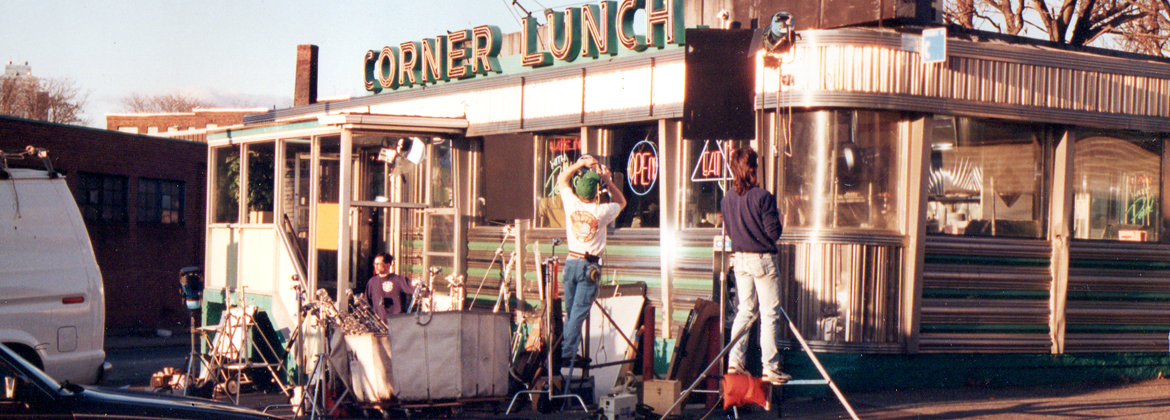 The crew is seen here setting up lighting outside a classic Worcester diner in preparation for interior filming of a cable company promotional ad.