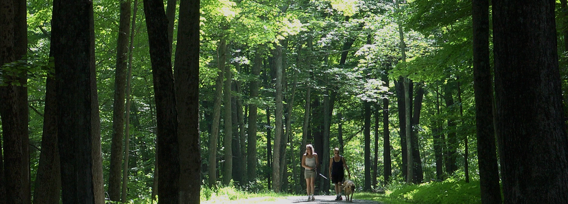 A frame from the Sturbridge Tourism video showing a peaceful scene on a walking path along the Quinetissett River.